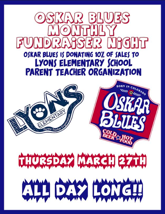 - Mar. 27th….PTO Fundraiser at Oskar Blues ALL DAY!